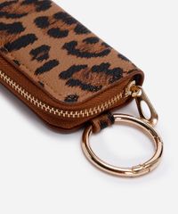 Chaveiro bag charm carteira desenvolvido em material sintético resistente com estampa animal print. O modelo tem formato retangular, fechamento por zíper e fecho argola.