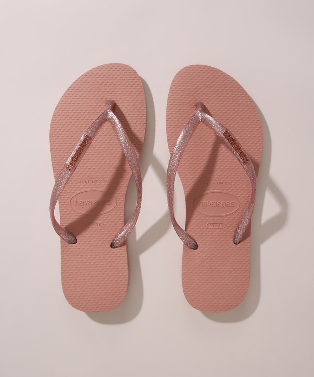 Chinelo feminino desenvolvido em material emborrachado resistente. O modelo Slim tem bico redondo e cabedal de tiras finas texturizadas com glitter, inscrição de marca em metal e encaixe para dedo. Tem solado com a textura clássica da marca. A sola é texturizada e proporciona segurança e firmeza na hora de caminhar.