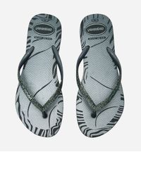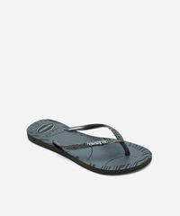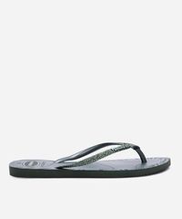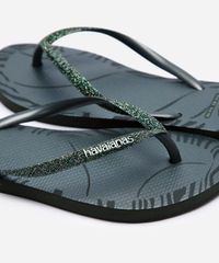 Chinelo desenvolvido em material emborrachado resistente com estampa abstrata. O modelo tem bico arredondado e cabedal de tiras finas com aplicação de brilho e logomarca e suporte para encaixar os dedos. A sola é texturizada e auxilia no caminhar.
