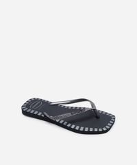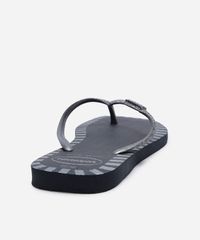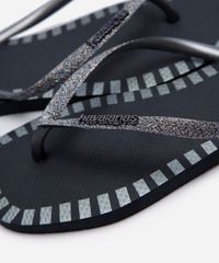 Chinelo desenvolvido em material emborrachado resistente com estampa de listras. O modelo square tem bico quadrado e cabedal de tiras finas com aplicação de brilho e logomarca e suporte para encaixar os dedos. A sola é texturizada e auxilia no caminhar.