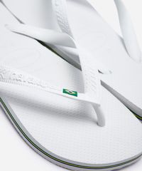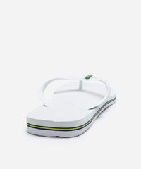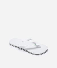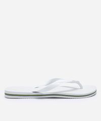 Chinelo desenvolvido em material emborrachado resistente com estampa de listras. O modelo tem bico redondo e cabedal de tiras finas com logomarca e suporte para encaixar os dedos. A sola é texturizada e auxilia no caminhar.