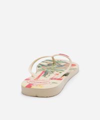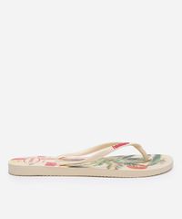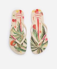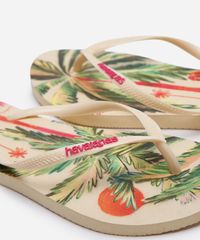 Chinelo Havaianas Slim Bliss desenvolvido em material emborrachado resistente com estampa tropical. O modelo tem bico redondo, cabedal com tiras finas e suporte para encaixar os dedos. Possui sola texturizada que auxilia no caminhar.