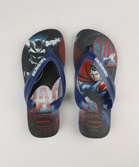Chinelo confeccionado em material emborrachado e resistente. Tem estampa com os heróis Super Homem e Batman. O modelo tem cabedal de dedo com inscrição da marca.