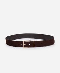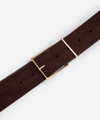 Cinto desenvolvido em material sintético resistente com textura de camurça. O modelo tem fivela quadrada fina e passante em metal com diferentes níveis de ajuste.