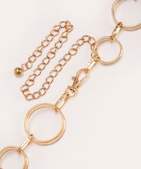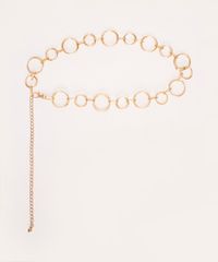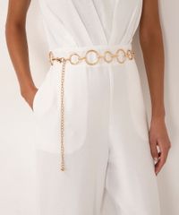 Cinto desenvolvido em metal com banho dourado. Modelo com corrente delicada, formado por elos e fechamento por mosquetão com níveis de ajuste.