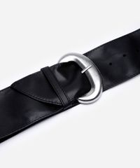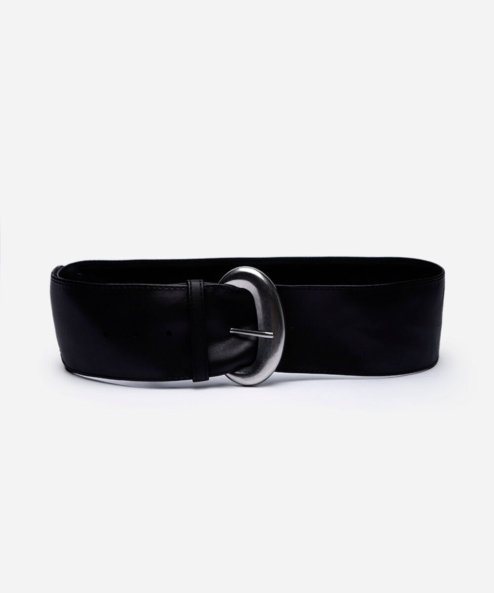 Cinto faixa desenvolvido em material sintético maleável. O modelo é largo, com contorno pespontado passantes fixo e fechamento por fivela meia lua com níveis de ajuste.