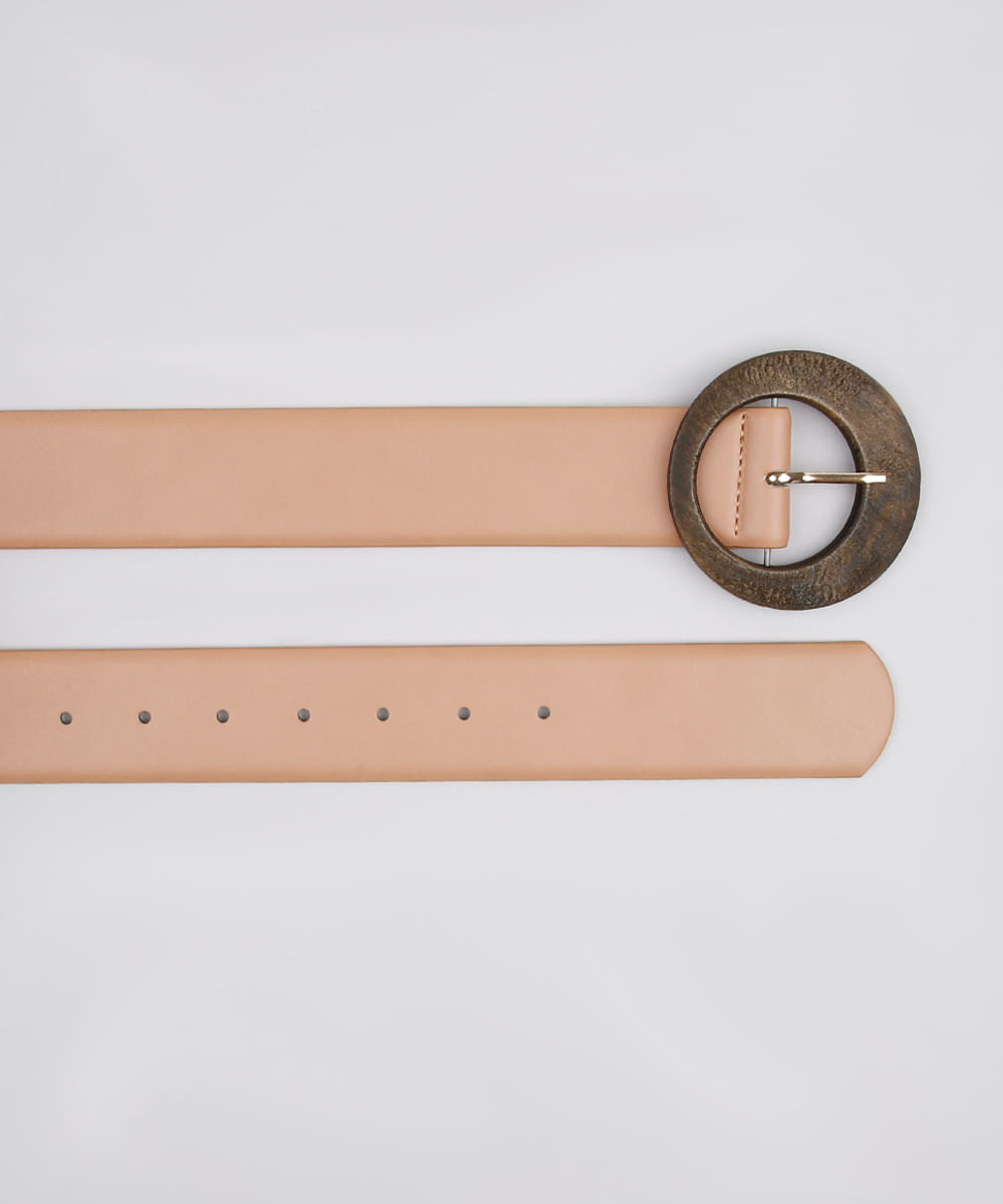 Cinto feminino desenvolvido em material sintético. O interior é metalizado. O fechamento é por fivela redonda amadeirada com níveis de ajuste.