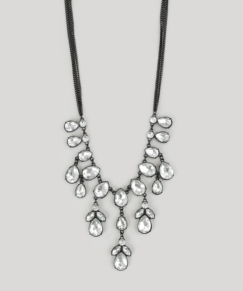 Colar desenvolvido em metal. O modelo tem pingentes com strass. O fechamento é por mosquetão com níveis de ajuste.