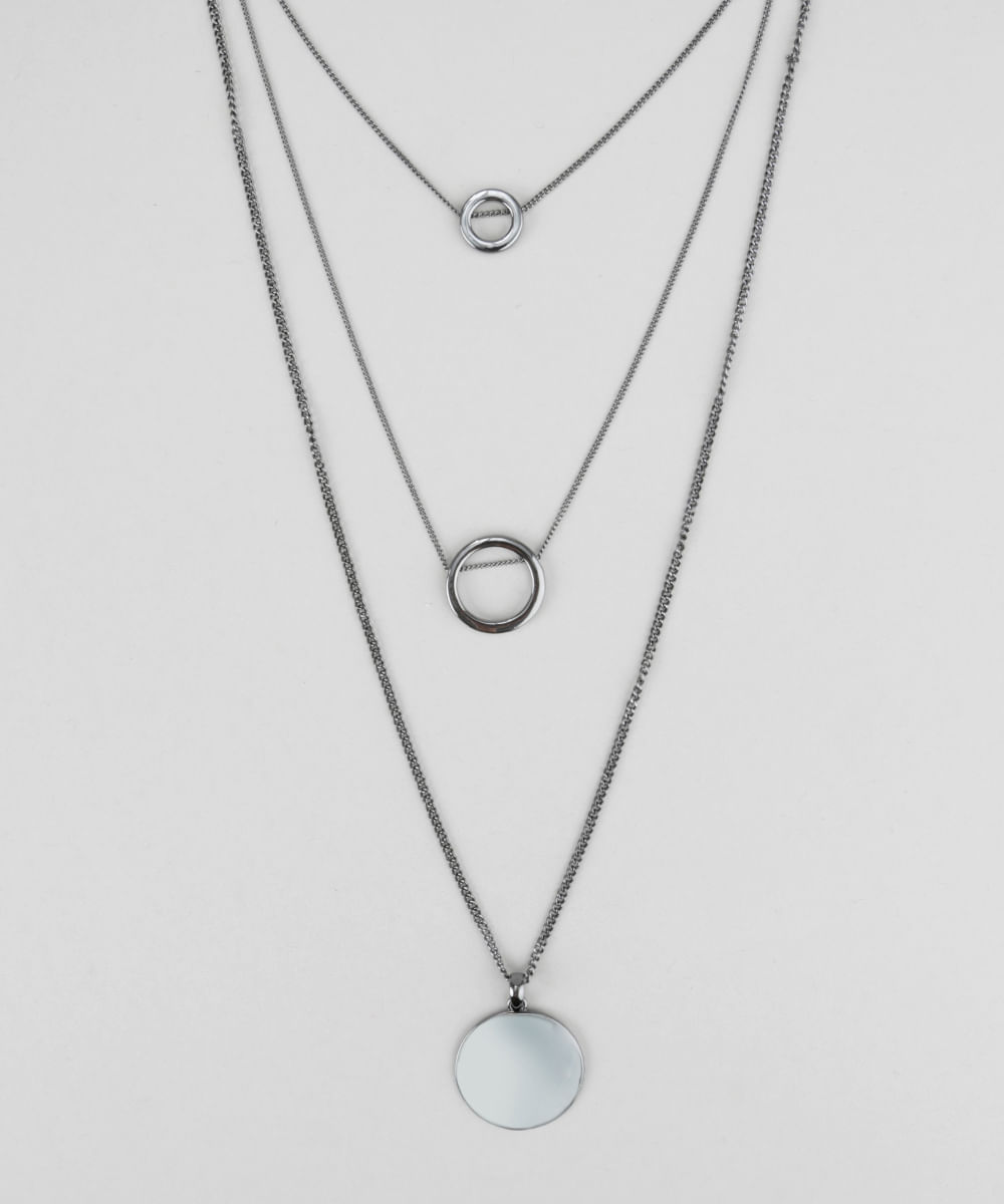 Colar desenvolvido em metal. O modelo longo tem três níveis com pingentes aplicados. O fechamento é por mosquetão com níveis de ajuste.