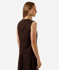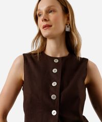 Colete feminino de alfaiataria confeccionado em tecido plano com viscose e linho. A peça tem a modelagem e construção reta e o caimento é confortavelmente solto ao corpo. O modelo tem decote redondo, alças largas e fechamento frontal por botões em vista. Possui forro em tecido plano e dois bolsos decorativos.