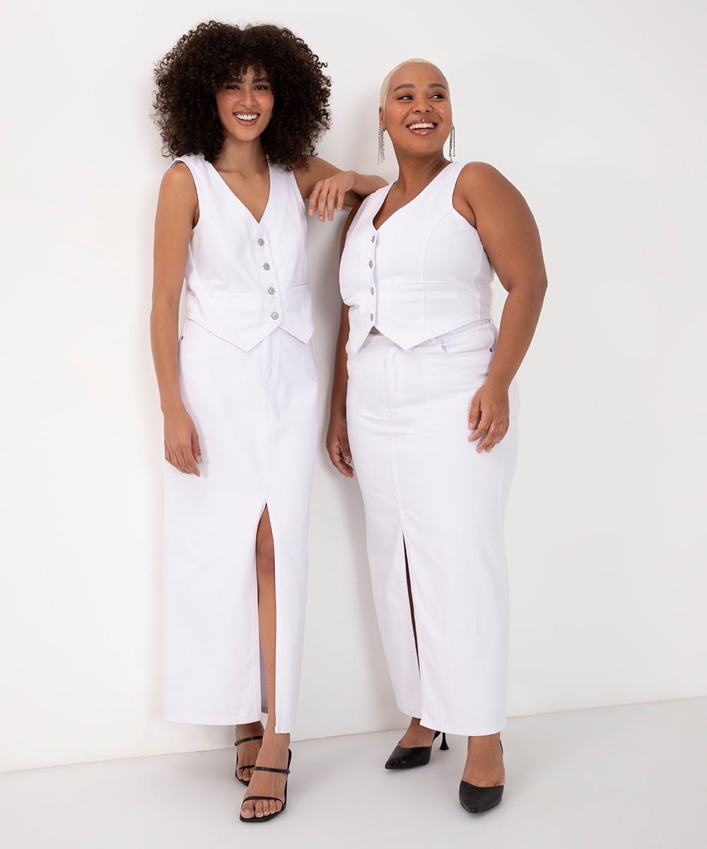 Use este colete fechado como um top para um visual ousado e contemporâneo, ou aberto sobre blusas e regatas para criar uma sobreposição estilosa. Ele combina perfeitamente com calças de alfaiataria, saias longas ou uma calça jeans feminina de cintura alta, transitando facilmente entre o escritório e um passeio no fim de semana. Para um look monocromático impactante, combine com outras peças de sarja no mesmo tom.