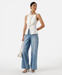 Colete feminino confeccionado em sarja. A peça tem a modelagem acinturada e o caimento é levemente solto ao corpo. O modelo tem decote quadrado, fechamento frontal por botões em vista e alças finas. Detalhe de acabamento com recorte triangular e pespontado na barra.