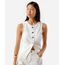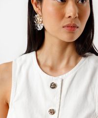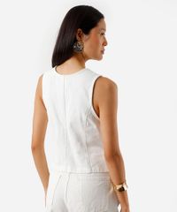 Colete feminino confeccionado em sarja estruturada de algodão. A peça tem a modelagem acinturada, caimento confortavelmente ajustado ao corpo com recortes verticais que modelam a silhueta. O modelo tem decote redondo elevado, fechamento frontal por botões texturizados em vista, alças largas e recorte triangular centralizado na barra.