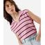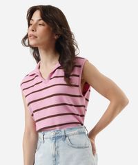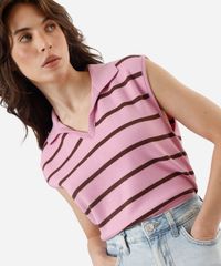 colete feminino de tricot com gola listrado rosa