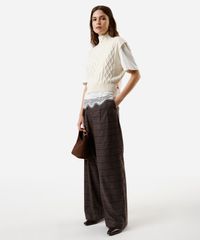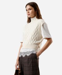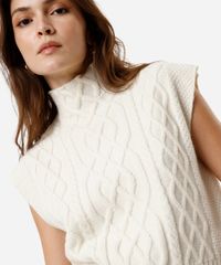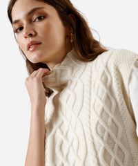 Colete feminino confeccionado em tricot com textura argyle. A peça tem a modelagem e construção reta e o caimento é confortavelmente solto ao corpo. O modelo tem gola alta e alças largas. Detalhe de acabamento com fendas na laterais.