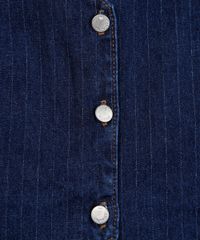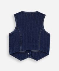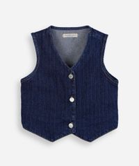Colete infantil confeccionado em jeans com padronagem risca de giz. A peça possui modelagem e caimento reto, decote V, alças largas, fechamento frontal por botões, detalhe assimétrico e acabamento pespontado interno.