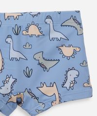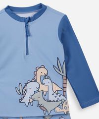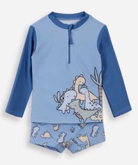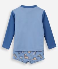 Conjunto infantil confeccionado em malha de poliamida com proteção 50+uva e uvb e estampa temática de "dinossauro". A camiseta possui gola alta com zíper, mangas longas, e acabamento pespontado. A sunga possui modelo box, cós elástico, caimento reto e acabamento pespontado. Composição: 85% poliamida 15% elastano Instruções de lavagem: - Lavar à temperatura máxima de 40ºC - Proibido o alvejamento - Não secar em tambor - Secagem em varal à sombra - Não passar - Limpeza à úmido, processo normal