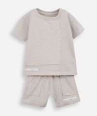 Conjunto de pijama infantil confeccionado em malha de algodão e recortes com textura canelada. Composto por camiseta e short. A camiseta tem modelagem reta, caimento solto ao corpo, estampa com escritos em inglês, mangas curtas e gola redonda. O short tem modelagem reta, caimento solto ao corpo, cós com elástico embutido, cordão para ajuste dois bolsos frontais e um posterior e acabamento pespontado nas barras.