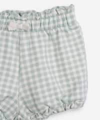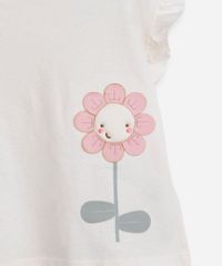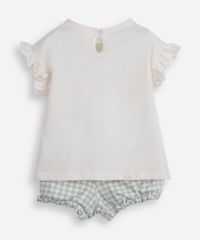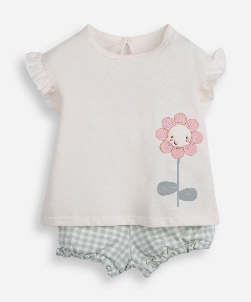 Conjunto composto por duas peças confeccionadas em algodão. Blusa com modelagem reta, caimento levemente solto e confortável, gola redonda, mangas curtas em babado, detalhe frontal em flor 3D e fechamento posterior com botão. Short com modelagem reta, caimento solto, cintura média modelo clochard com elástico embutido, detalhe de laço aplicado e barra com elásticos embutidos.