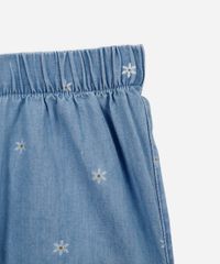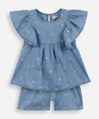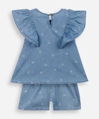 Conjunto infantil confeccionado em jeans leve com estampa floral. Composto por blusa e short. A blusa tem modelagem reta, caimento solto, recortes inferior, decote redondo, abertura por botão e mangas curtas. O short tem modelagem reta, caimento solto e cós com elástico embutido. Detalhe de acabamento pespontado nas barras.