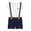 Esse conjunto é composto por um body confeccionado em malha e uma bermuda confeccionada em tecido plano. O body tem bordado frontal. O decote é redondo e as mangas são curtas. Tem fechamento por botões no decote e entrepernas. A bermuda tem dois bolsos fa