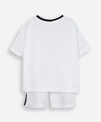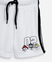 Conjunto infantil composto por duas peças confeccionadas em tecido sintético de alta absorção. Camiseta com modelagem reta, gola V com listra em cor contrastante, mangas curtas, detalhe frontal com estampa temática da Patrulha Canina e acabamento pespontado. Bermuda com modelagem reta, cintura média, cós com elástico embutido e cordão para amarração e ajuste com ponteiras, detalhes laterais com viés em cor contrastante, detalhe com estampa temática da patrulha canina e acabamento pespontado.