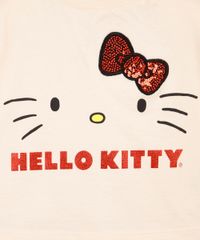 • Blusa com decote redondo, mangas curtas e uma adorável estampa da Hello Kitty com o laço bordado em paetês vermelhos brilhantes.