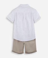 Conjunto infantil composto por duas peças confeccionadas em algodão. Camisa com modelagem reta, caimento solto, gola padre, mangas curta com martingale decorativo, bolso frontal, acabamento pespontado e fechamento com botões. Bermuda com modelagem reta, cintura média, cós com elástico embutido e cordão para ajuste de tamanho e amarração, passantes aplicados, dois bolsos frontais e um bolso posterior.