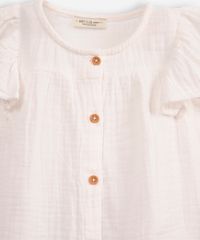 • Modelagem soltinha com decote redondo, mangas curtas com babados e fechamento frontal por botões que facilitam a troca.