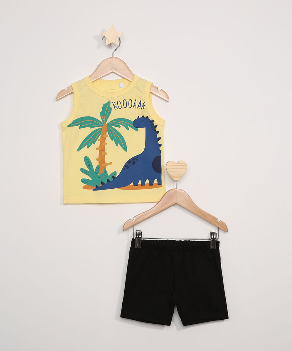 Conjunto infantil masculino confeccionado em malha de algodão. A regata tem estampa frontal de dinossauro. A bermuda é em moletom leve sem felpa, tem elástico embutido no cós.