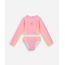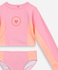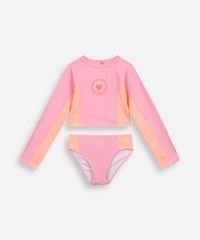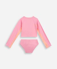 Conjunto de praia infantil composta por top e calcinha em design color block. Ideal para proporcionar conforto em dias de sol. O top apresenta modelagem cropped, mangas longas e decote redondo. A calcinha possui cós confortável e caimento ajustado ao corpo. Confeccionado em tecido leve, macio e de secagem rápida, o conjunto é perfeito para praia ou piscina, unindo praticidade e estilo.