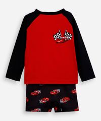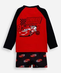 Conjunto infantil confeccionado em malha de poliamida com proteção 50+uva e uvb. A camiseta possui gola redonda, mangas longas, estampa frontal localizada do personagem "Relâmpago Macqueen" e acabamento pespontado. A sunga possui modelo box com padronagem do personagem "Relâmpago Macqueen" cós elástico, caimento reto e acabamento pespontado. Composição: 90% poliamida 10% elastano