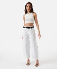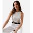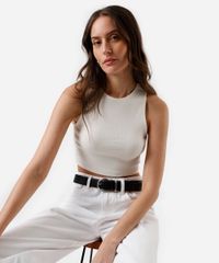 Cropped feminino confeccionado em malha canelada de algodão. A peça tem modelagem confortavelmente ajustada ao corpo. O modelo tem decote redondo e alças largas. Detalhe de acabamento pespontado.