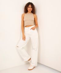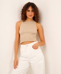 Cropped confeccionado em poliamida com textura canelada. Possui modelagem reta, ajustada ao corpo, decote halter neck, alças médias, barra em elástico e recorte em listras.