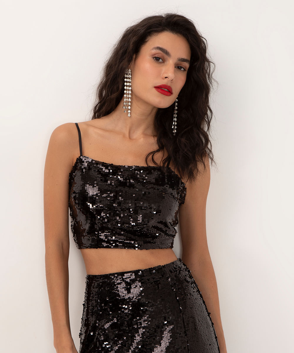 Para um visual impactante, combine este top cropped com uma saia de paetê para formar um conjunto poderoso. Se a ideia é um look mais equilibrado, aposte em uma calça de alfaiataria de cintura alta ou em um jeans de lavagem escura. Adicionar um blazer alongado cria uma sobreposição elegante e moderna. Finalize com sandálias de salto e acessórios que complementem o brilho da peça.