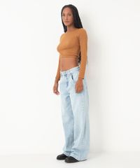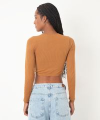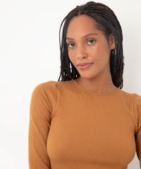 Blusa confeccionada em malha de poliamida canelada. A peça possui gola redonda, mangas longas, caimento ajustado ao corpo, comprimento cropped e acabamento elástico.