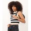 Regata confeccionada em tricot com toque macio. A peça possui modelagem cropped com caimento levemente justo ao corpo, decote redondo, alças largas es em mangas, padronagem listrada e acabamento canelado.