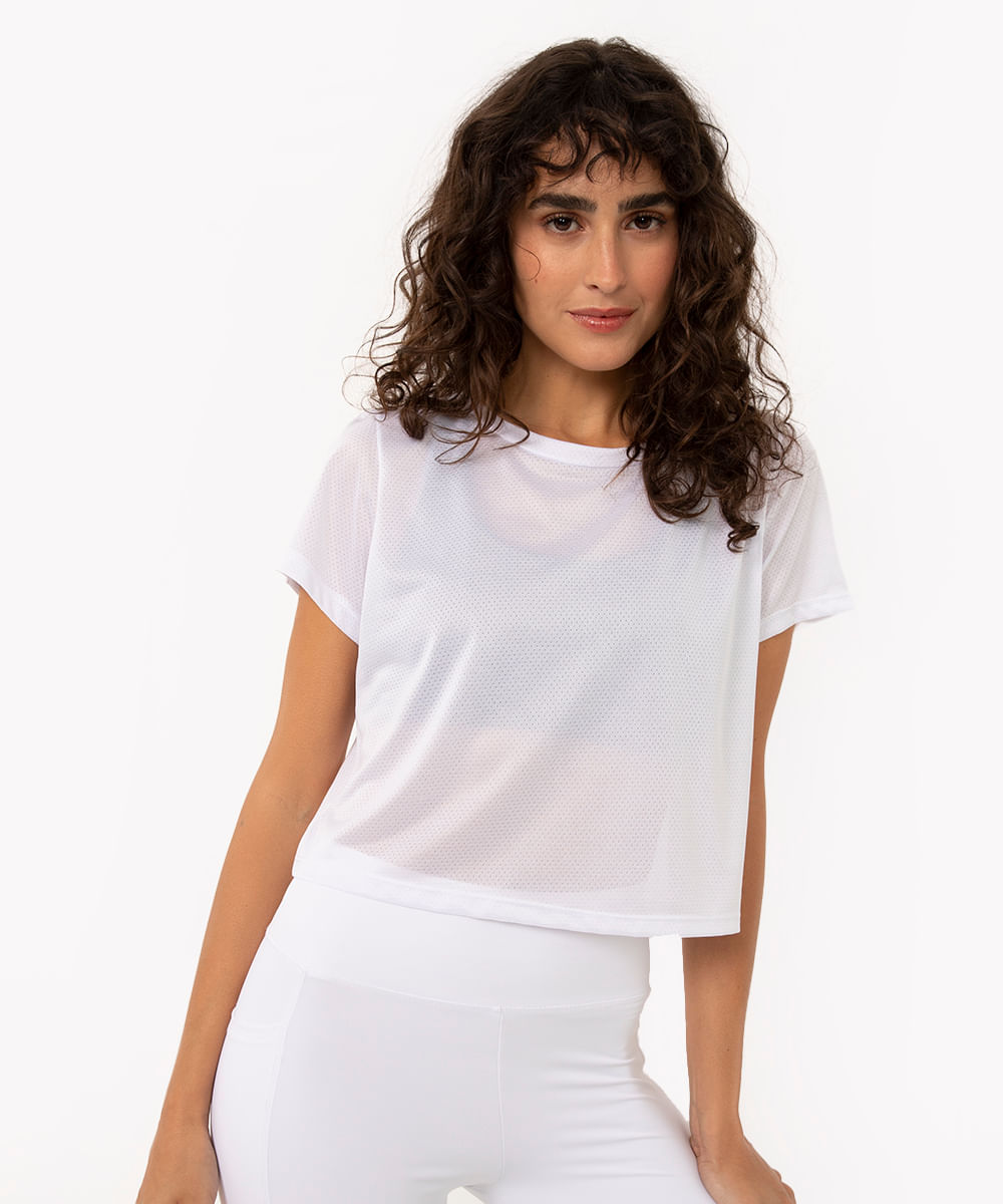 Camiseta confeccionada em malha leve de padronagem vazada. Possui modelagem cropped de comprimento curto, caimento solto, gola redonda, mangas curtas e acabamentos em pesponto.