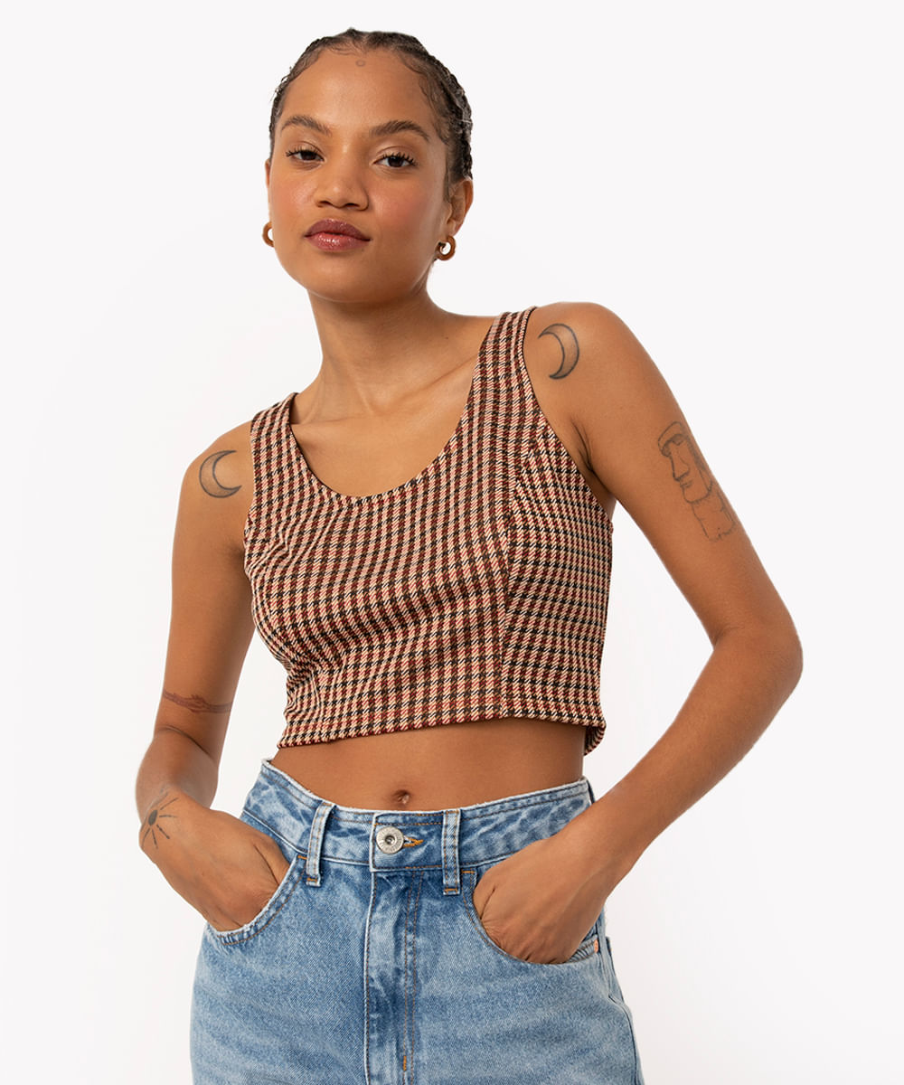 Blusa confeccionada em malha com padronagem xadrez princípe de gales. A peça possui decote redondo, recortes frontais, alças largas com cavas regulares, comprimento cropped, caimento ajustado ao corpo e acabamento pespontado.