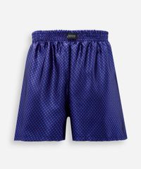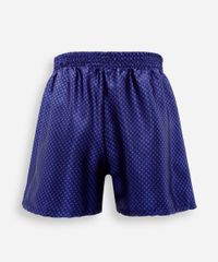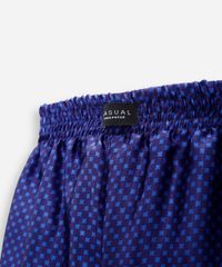 Cueca masculina masculina confeccionada em tecido plano acetinado com estampa geométrica. A peça tem modelagem reta e caimento solto ao corpo. O modelo tem cintura média, cós com elástico embutido e acabamento pespontado nas barras.
