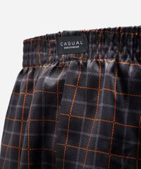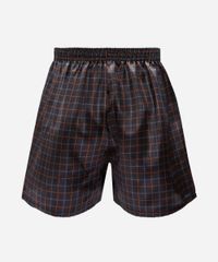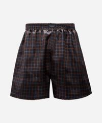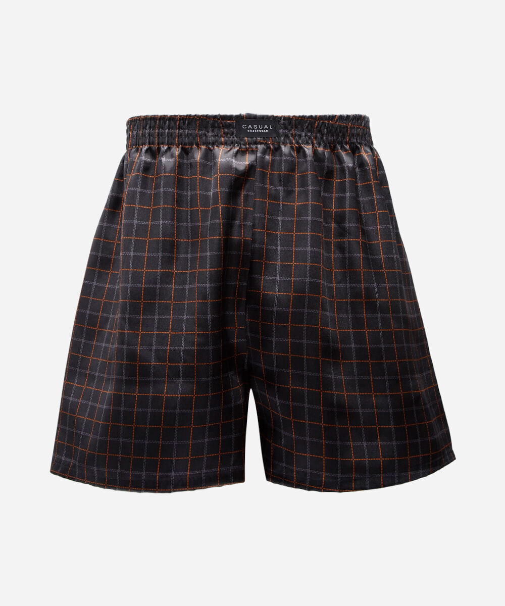 Cueca masculina confeccionada em tecido plano acetinado com padronagem xadrez. A peça tem modelagem samba canção, com construção reta e caimento solto ao corpo. O modelo tem cós com elástico embutido e acabamento pespontado nas barras.