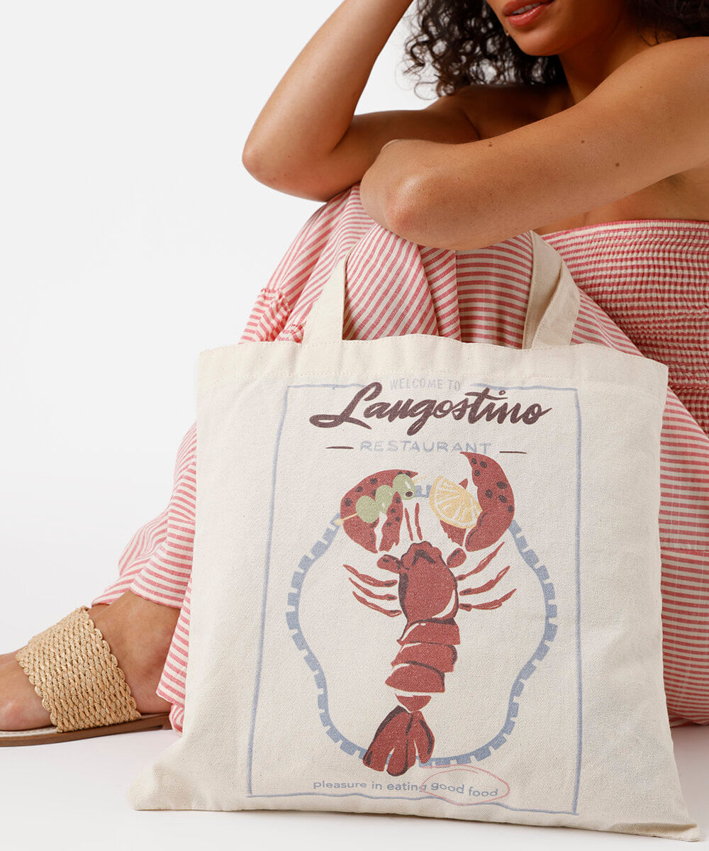 Ecobag confeccionado em tecido plano com algodão com ilustração de lagosta e a palavra "langostino". O modelo tem alças de ombros e acabamento pespontado nas extremidades.