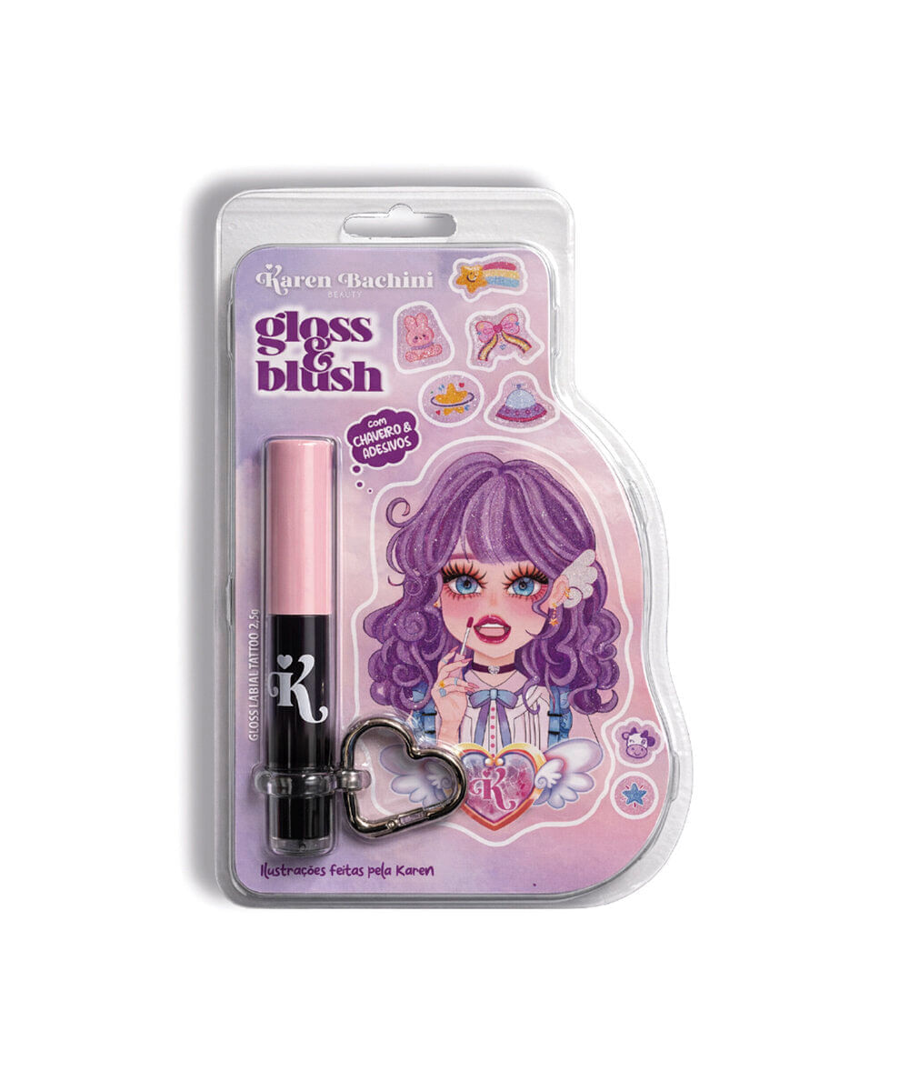 Tem anel de silicone e um mosquetão em formato de coração super fofo que transforma ele em chaveiro e você pode levar com você pra onde quiser. E não para por aí: essa edição vem com uma cartela colecionável de adesivos desenhados com muito carinho por mim. Três modelos diferentes, um para cada gloss! Pra completar, a boneca é um adesivo gigante, pra você colar onde sua criatividade mandar!