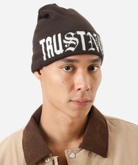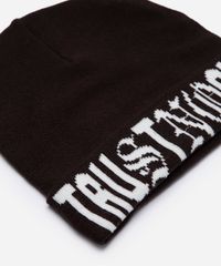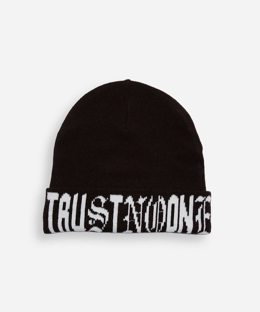 Gorro confeccionado em tricot leve com padronagem escrito "trust no one". O modelo tem formato anatômico e caimento ajustado.