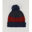 Gorro masculino confeccionado em tricô de ponto diferenciado. O modelo tem listras em diferentes cores. Possui pompom aplicado e barra dobrada.