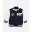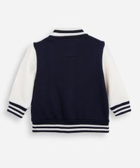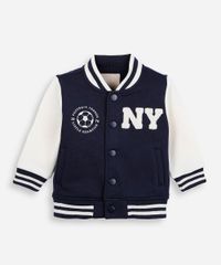 Jaqueta infantil confeccionada em moletom com felpa interna e toque macio. A peça possui modelagem bomber com caimento reto e levemente solto, decote redondo, mangas longas, fechamento por botão de pressão, dois bolsos frontais estilo faca, estampa bordada e texturizada em cores contrastantes, detalhe de listra nos acabamentos canelados.
