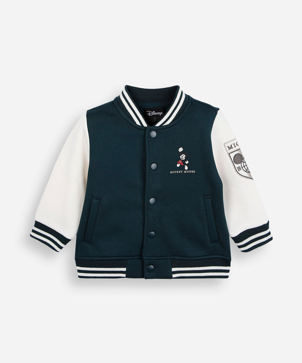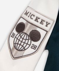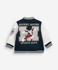 Jaqueta infantil confeccionada em moletom com felpa interna e toque macio. A peça possui modelagem bomber com caimento reto e levemente solto, decote redondo, mangas longas com detalhe bordado em uma delas, fechamento por botão de pressão, dois bolsos frontais estilo faca, estampa frontal e posterior com desenho do personagem Mickey em cores contrastantes, detalhe de listra nos acabamentos canelados.