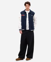 Jaqueta college masculina confeccionada em moletom felpado com estampa localizadas do Hot Wheels. A peça tem a modelagem e construção reta e o caimento é confortavelmente solto ao corpo. O modelo tem gola esporte aplicada, fechamento frontal por botões de pressão em vista e mangas longas. Possui dois bolsos frontais. Detalhe de acabamento em malha canelada na barra e punhos.