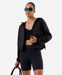• Fechamento frontal por zíper, punhos com elástico e barra com ajuste para um caimento seguro.