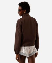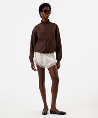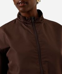 • Gola alta e fechamento frontal por zíper com puxador de argola, um toque contemporâneo.